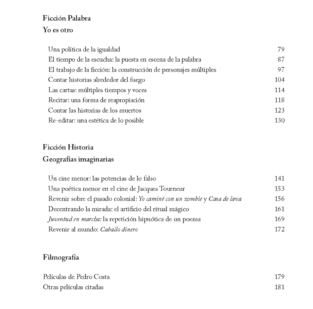 “Los personajes en el cine de Pedro Costa son multiplicidades. Ventura es un albañil jubilado y un inmigrante obrero de 17 años; es un contador que lleva la cuenta de sus salarios, de las fechas (el día en que llegó a Lisboa, el día de la Revolución) y es un poeta que recita repetidas veces una carta de amor; es un narrador de extensos monólogos y una presencia silenciosa. Ventura, como los otros personajes, se constituye con y a partir de sus encuentros con otros cuerpos, con otras fuerzas. Las secuencias captan intensidades, la precisión de un gesto, el trazo de una mirada, el pensamiento en movimiento del personaje o sus abismos.” p.150