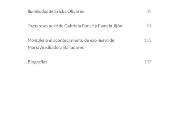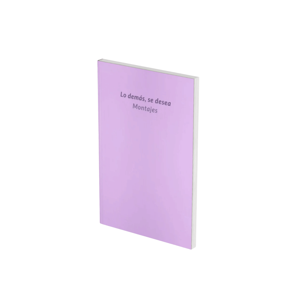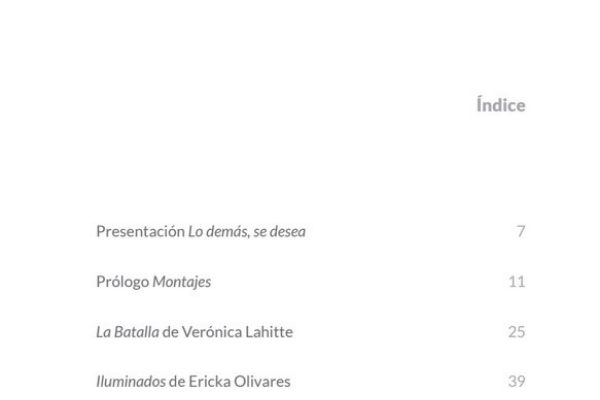 Montajes es el segundo libro de la serie Lo demás, se desea y contiene el guion performático La batalla de Verónica Lahitte; la instalación Iluminados de Ericka Olivares; la obra de teatro Tazas rosas de té de Pamela Jijón y Gabriela Ponce; y un texto reflexivo sobre este ensamble, Montajes o el acontecimiento de eso nuevo de María Auxiliadora Balladares.