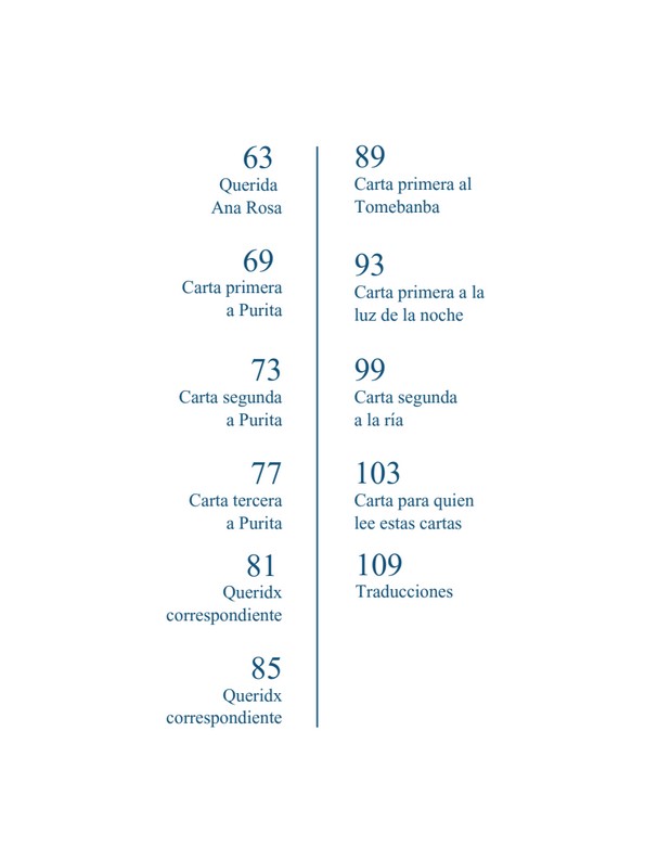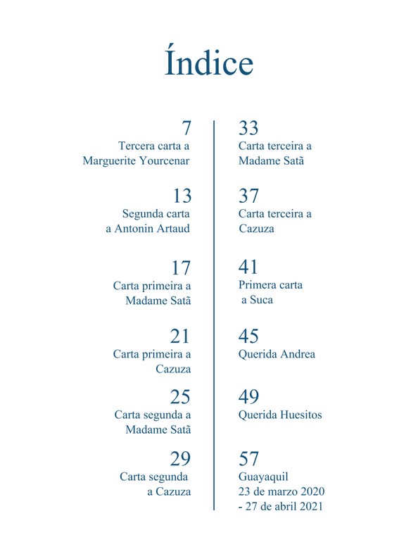 En esta compilación de cartas, Andrea Alejandro Freire escribe para Marguerite Yourcenar y Antonin Artaud. Inventa una correspondencia entre Madame Satã y Cazuza. Dirige otras cartas a Suca, Andrea, Huesitos, Ana Rosa y Purita. Le escribe al Tomebamba, a la ría y a la luz de la noche.
